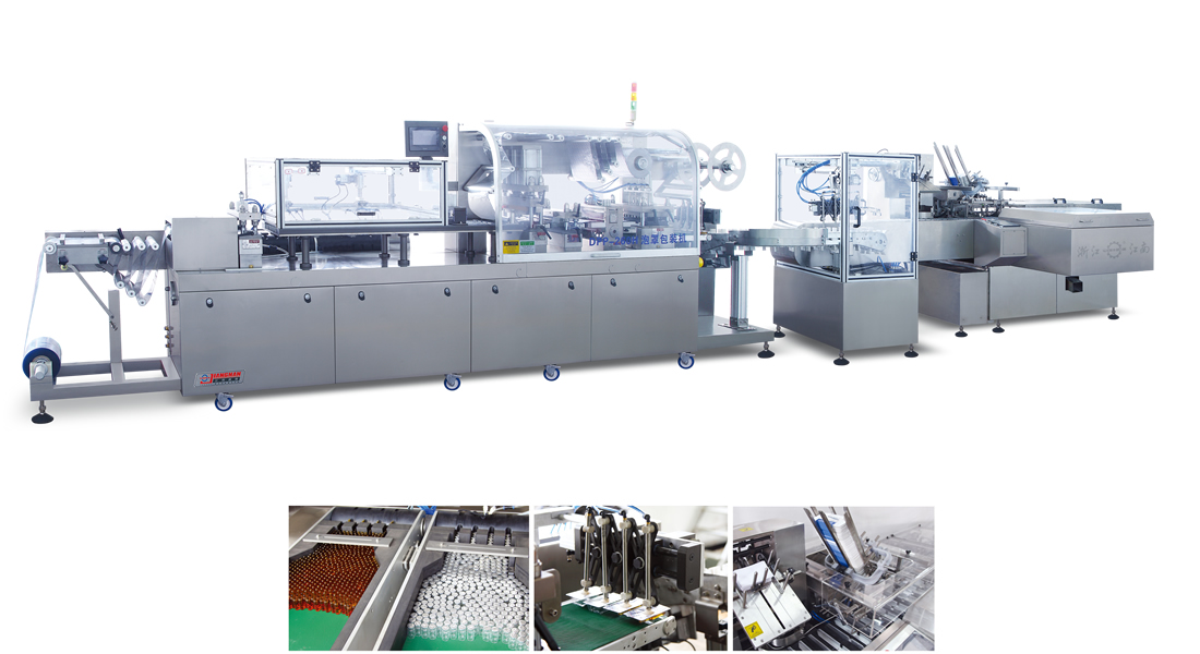 本机专用于单支安瓿瓶、单支西林瓶的混合外包装。整机组成有塑托成型、安瓿瓶加料、西林瓶加料、热封、冲切、装盒。由PLC控制,先进的自检功能,自动识别破泡罩、缺瓶、缺说明书及空盒检测记忆并对废品100%剔除,可实现药瓶的自动入托、说明书自动装盒等功能。